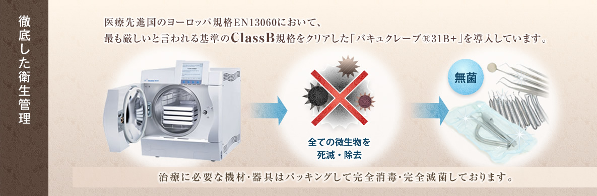 森下ベリタス歯科では、大切な患者様のお身体をお守りし、安心して通院して頂ける環境作りを提供するため、ClassB規格をクリアした滅菌器を導入しております。