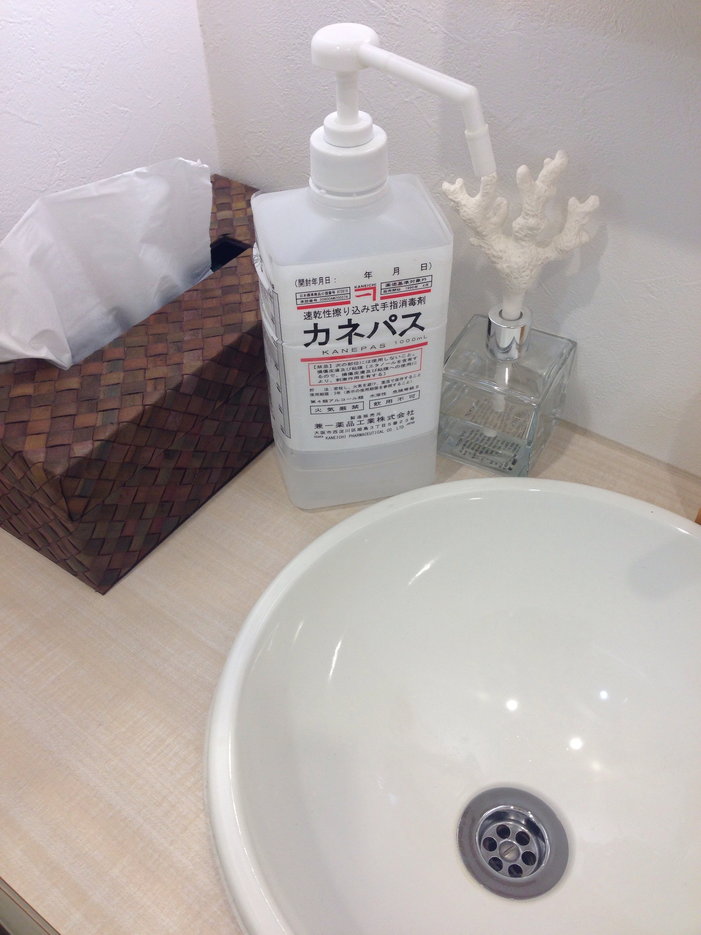 また、通路にあるパウダーコーナーにも、手指消毒液も置いてありますので、