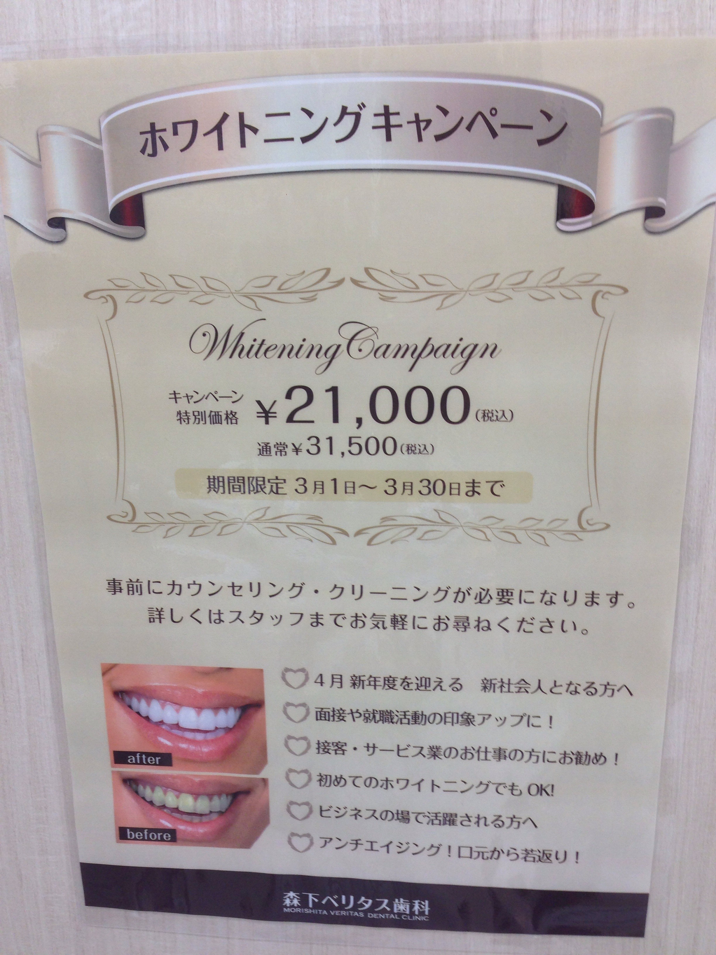さて、森下ベリタス歯科では、春に向けてホワイトニングキャンペーンを